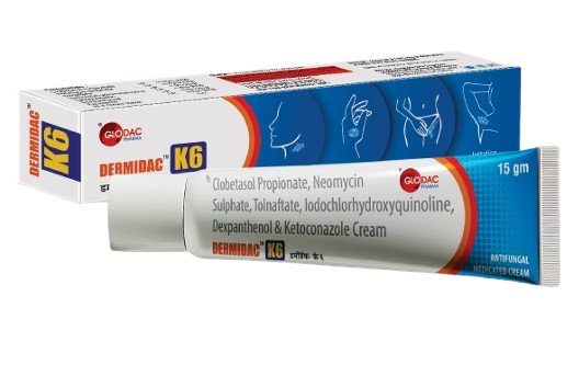 Dermidac K6 is a keratolytic preparation used to treat skin conditions with thickened, scaly, or dry patches. It works by softening and removing the hardened outer layer of skin, helping in faster shedding of dead cells. This reduces scaling, itching, and dryness while improving skin hydration. By clearing excess keratin buildup, Dermidac K6 helps other topical medications penetrate better and enhances overall skin healing.